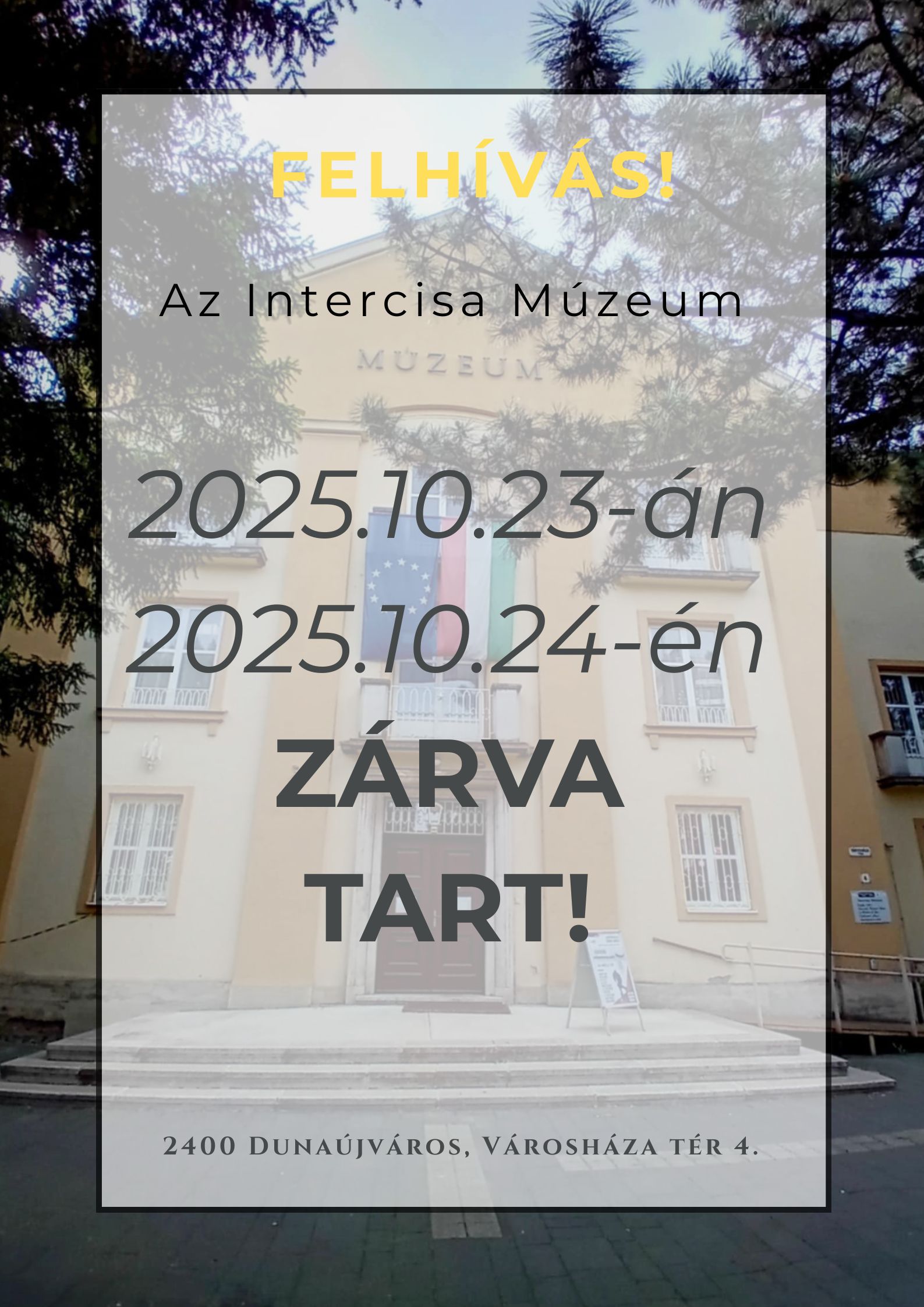 2025. október 23. 10 óra Kedves Látogatóink!Az Intercisa Múzeum 2025. október 23-án és 24-én zárva tart. Október 25-én, szombaton a megszokott nyitvatartással várunk mindenkit 14 és 18 óra között.Megértéseteket köszönjük!